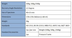 Thiết bị tải và kiểm tra độ phục hồi nếp gấp GT-C21-1 dùng để xác định đặc tính phục hồi của vải bằng cách đo góc phục hồi sau khi gấp và tạo nếp dưới tải trọng tĩnh, phương pháp thử theo tiêu chuẩn BS, ISO, AATCC.
